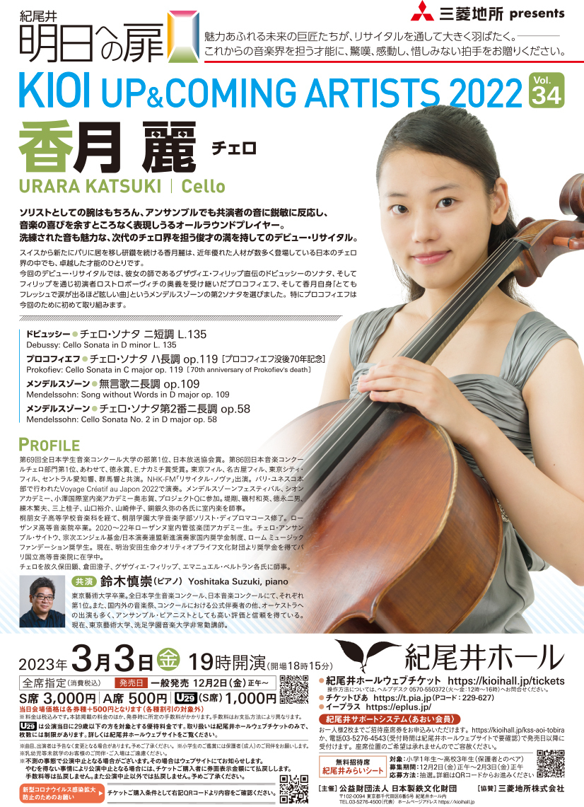 スイスからパリに居を移され、研鑽を続けるスズキ・メソードチェロ科出身の香月麗さん。ソリストとしての腕はもちろん、アンサンブルでも他者の音に鋭敏に反応できるオールラウンドプレイヤーとして、活躍されています。洗練された音も身体いっぱいで表現されるその姿も、比類なき美しさです。ご堪能ください。