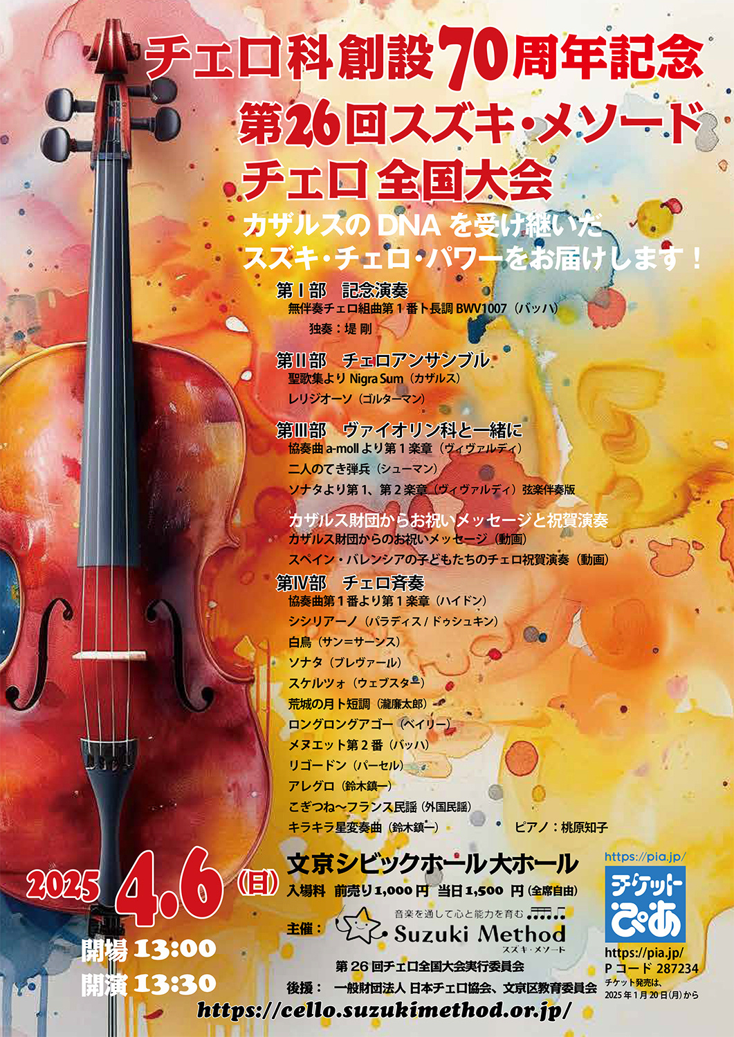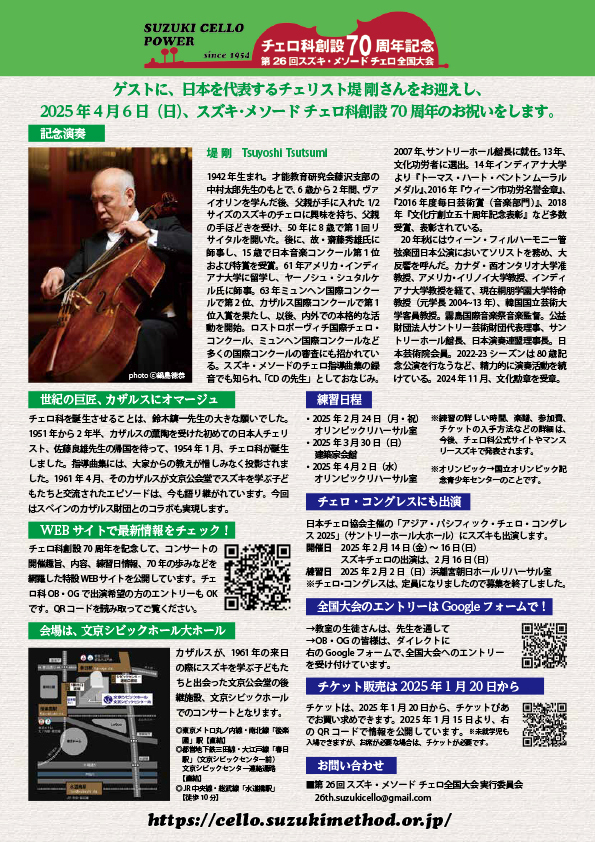 ゲストに、日本を代表するチェリスト堤 剛先生をお迎えし、2025年4月6日(日)、文京シビックホール大ホールにて、スズキ・メソードチェロ科創設70周年のお祝いをします。堤 剛さんは、かつてスズキでヴァイオリンを学ばれ、スズキでチェロを学ぶ誰もが毎日聴いている「CDの先生」ですが、2024年秋には、文化勲章も受章された「大先輩」でもあります。