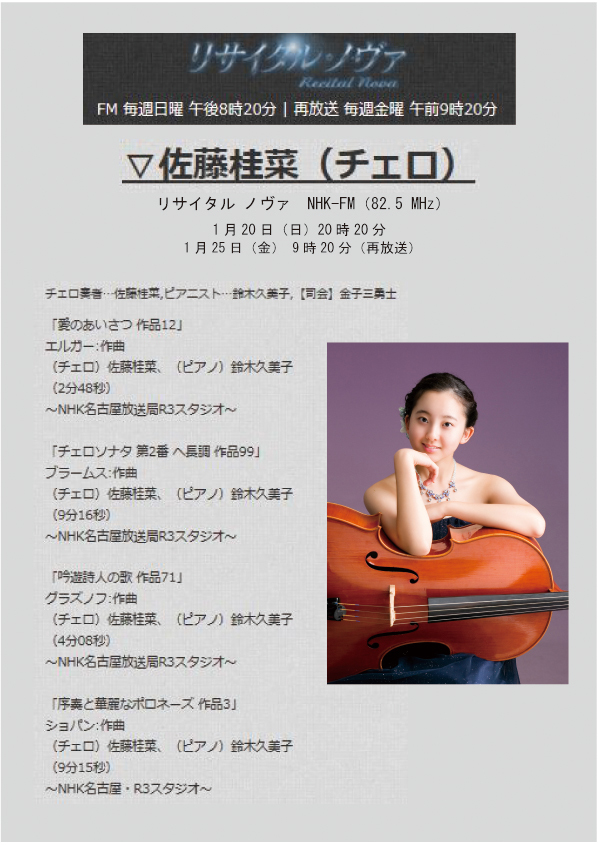 故久保田顕先生のもとで3歳からチェロを学んできた佐藤桂菜さん。廣岡クラスを経て、素晴らしい活動を続けていらっしゃいます。急なお知らせですが、来たる1月20日(日)20時20分からNHK・FM「リサイタル・ノヴァ」に登場されます。再放送もありますので、ぜひ聴いてください。
