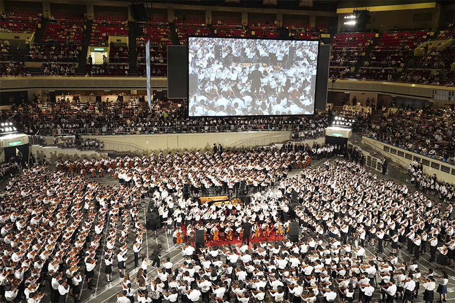鈴木鎮一生誕120周年記念「第54回 スズキ・メソード グランドコンサート」を2018年4月4日(水)、両国国技館(東京)で開催しました。前回の2011年の開催が東日本大震災で中止を余儀なくされたため、コンサートは実に9年ぶりの開催となりました。当日は快晴の天気のもと、国内から約2,000名が集まり、オーストラリア、台湾、韓国、キプロス、シンガポールからも約40名が参加されました。プログラム後半には天皇、皇后両陛下と高円宮妃久子殿下がご臨席され、フィナーレの約2,000名による「キラキラ星変奏曲」などをご覧になり、温かい拍手を送っていらっしゃいました。両陛下には、皇太子ご夫妻時代から何度もご覧いただいているグランドコンサートですが、いつもは大相撲を観戦されるお席での久しぶりのコンサートでの子どもたちが一生懸命に演奏する様子に、身を乗り出されてご覧になられる姿が、大変印象的でした。