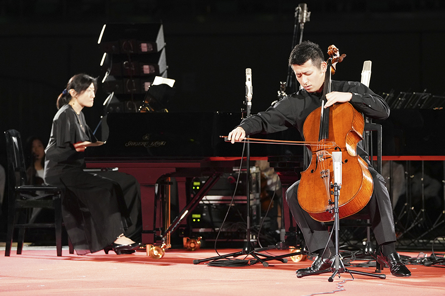 プログラムの後半では、 宮田大さんが、スポットライトを浴びる中、特別演奏として、チェロ奏者の大切なレパートリーでもあるブルッフの「コル・ニドライ」(ピアノ:石川咲子先生)を披露されました。大さんの織りなす音楽は、大きな感動をもたらす力にあふれたものでした。まるで、音符の一つひとつに練り上げられた職人の技を垣間見せるかのよう。前半の「祈り」のイメージ、後半の生命力にあふれた「生きる歓び」を体現された演奏は、宮田大さんの「今」を伝えていました。この先、未来にわたり、どこまでこの卓越した音楽性を私たちは楽しむことができるのだろうかと、同時代に生きている幸せを感じさせたほどです。