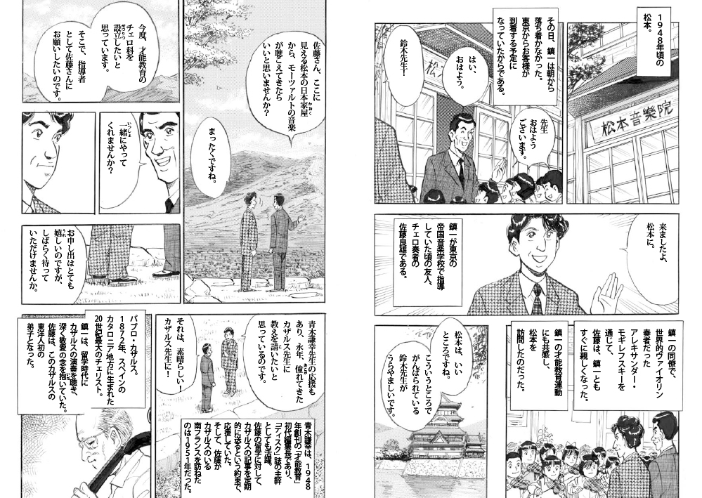 チェロについては、鈴木先生が戦前に東京の帝国音楽学校で指導をされていた頃の友人で、チェロ奏者として活躍されていた佐藤良雄先生に、鈴木先生は「チェロ科を設立したい」という夢を語っています。佐藤良雄先生は永年にわたり、カザルスから教えを請いたいという熱い気持ちを持っていたこと、そして近々、それが実現できそうであることを語り、「今しばらく、お時間をください」と伝えています。鈴木先生も尊敬するカザルスに、佐藤良雄先生が直接チェロを教えていただけることに大賛成でした。その様子が「音に心を、音にいのちを〜世界の扉を開けた“鈴木鎮一”マンガ物語」(発行:全音楽譜出版社)で紹介されています。