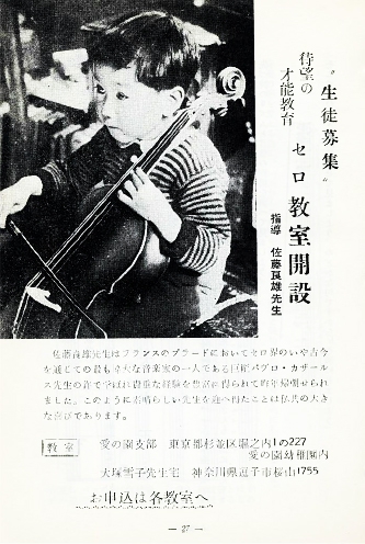 | 1955年3月27日 | 第1回全国大会に佐藤良雄先生が4人の門下生とともに出演。 「才能教育」第78号に「待望のチェロ教室開設」の広告を掲載。 |