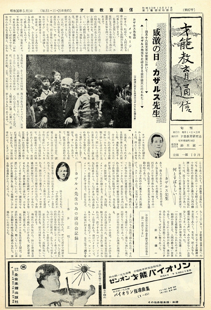1960年代の最大のトピックスは、何と言っても1961年のカザルスの来日です。4月16日、文京公会堂にマルタ夫人とともに現れたカザルスは、400名の生徒たちの中に入って、涙ぐみながら、そして感動に震える声で、素晴らしいメッセージをお話しされました。その時の様子を、才能教育通信紙上で鈴木鎮一先生は、「30年来、その音楽と奏法と偉大な人間の精神とを究めつつ、今日までやってきた私にとっては、限りなき大きな喜びであった」と記し、通訳の任に当たられた理事の本多正明先生も、カザルスの一挙手一投足をつぶさに観察し、そのすべてを伝えていらっしゃいます。スズキ・メソードを学ぶ子どもたちの姿が媒介となって、真の芸術家との魂と魂のふれあいがあったことが、見て取れます。