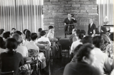 | 1954年 | 佐藤良雄先生、帰国。帰朝演奏会を開くとともに、チェロ科創設に邁進。 夏期学校3日目(7月30日)、佐藤良雄チェロ独奏会が開かれた。 生徒第1号が斎田出(さいたいずる)、その後、林 峰男、松波恵子姉妹らが続いた。 |