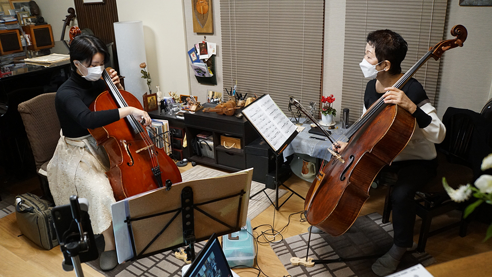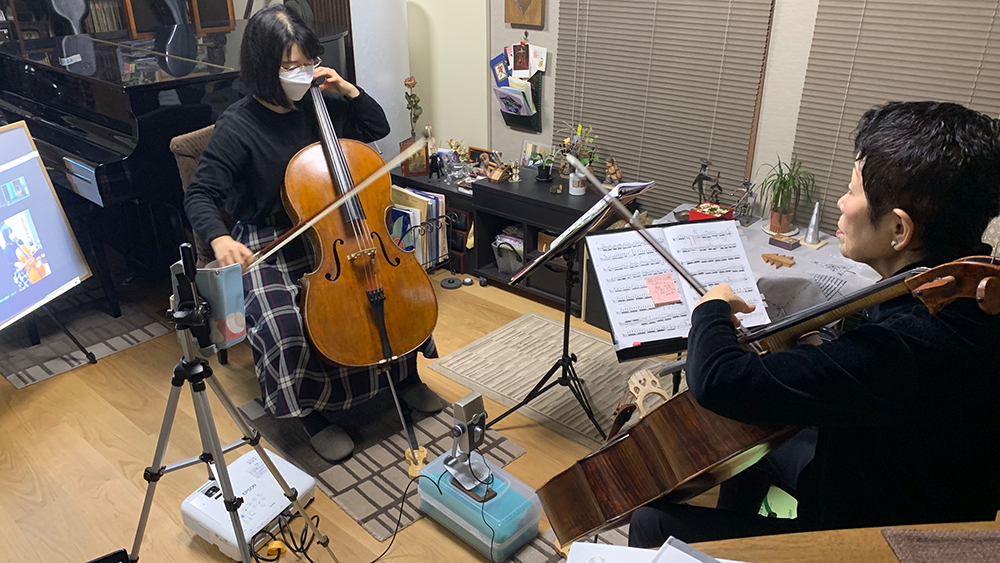 2021年10月21日及び11月19日の2日間、秋のチェロ科研究会を開催しました。2人のチェロ科指導者が、特別講師の倉田澄子先生のご指導を受ける様子を、他の全国チェロ指導者がオンライン同時配信で聴講と質疑応答に参加する「ハイブリッド形式」での開催でした。