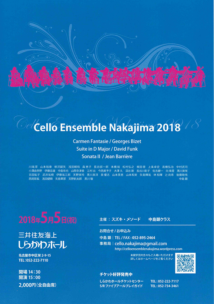 今回で4回目を迎えるチェロアンサンブル中島。中島クラス創設当時のOB、OGと現役生のメンバーで構成されたチェロアンサンブルのコンサートです。世代を超えてつながり合える音楽の素晴らしさを感じて頂ければ幸いです。
