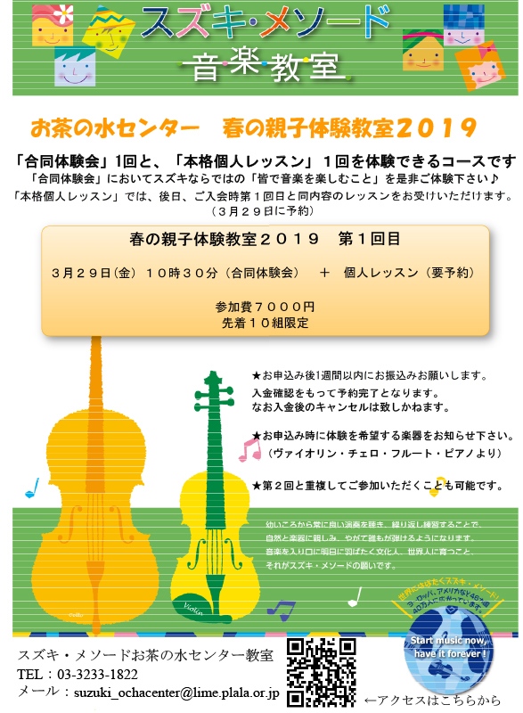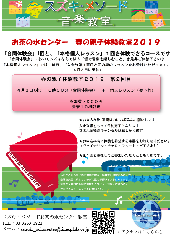 「合同体験会」1回と、「本格個人レッスン」1回を体験できるコースです。 「合同体験会」においてスズキならではの「皆で音楽を楽しむこと」を是非ご体験ください。 「本格個人レッスン」では、後日、ご入会時第1回目と同内容のレッスンをお受けいただけます。(3月29日に予約)