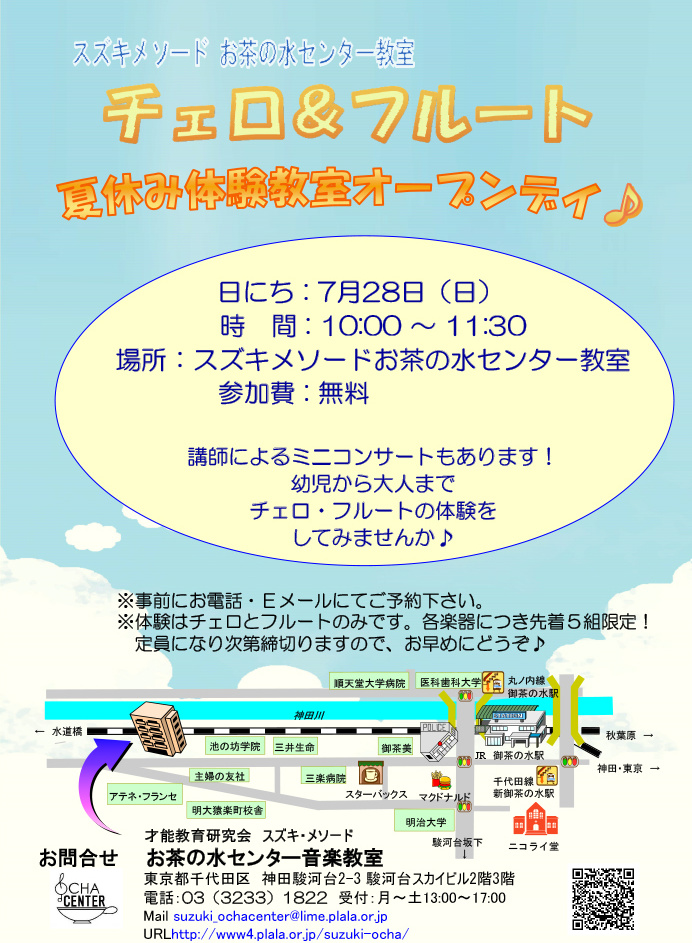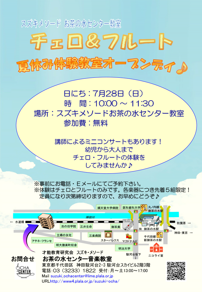 お茶の水センター チェロ&フルート 夏休み体験教室オープンデイ