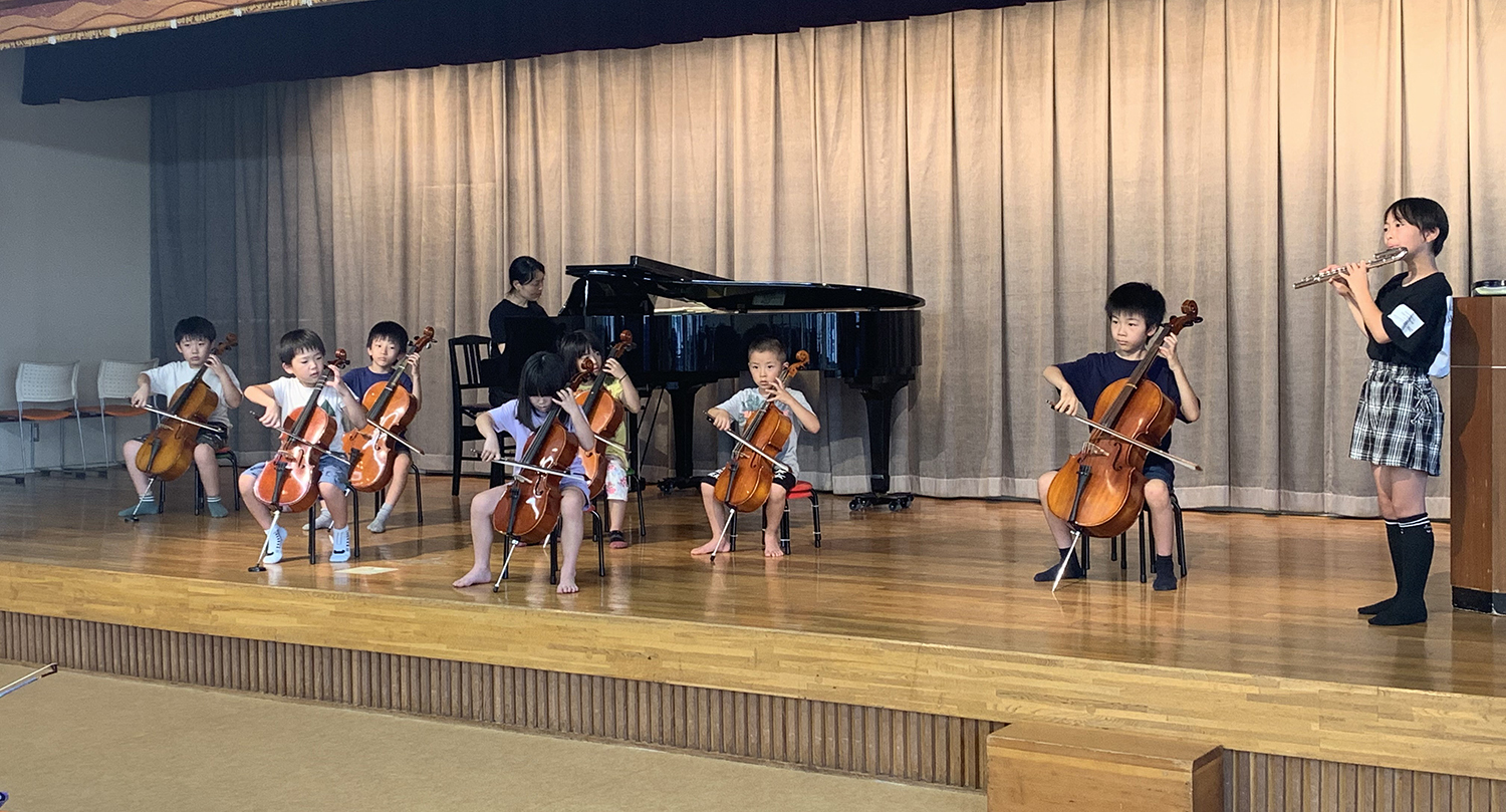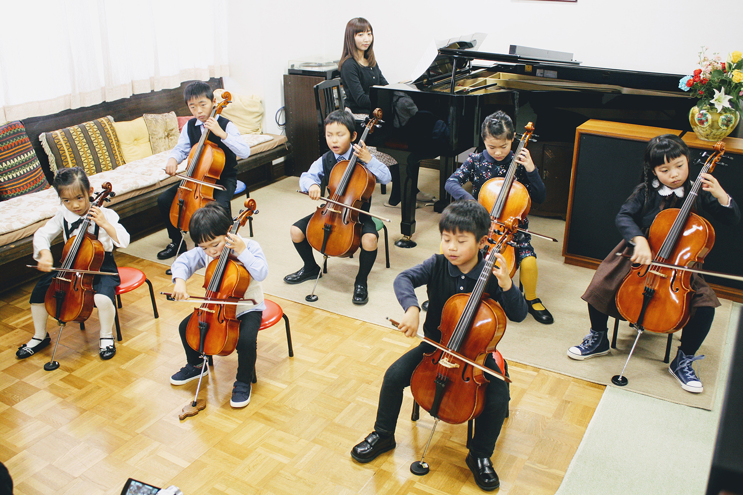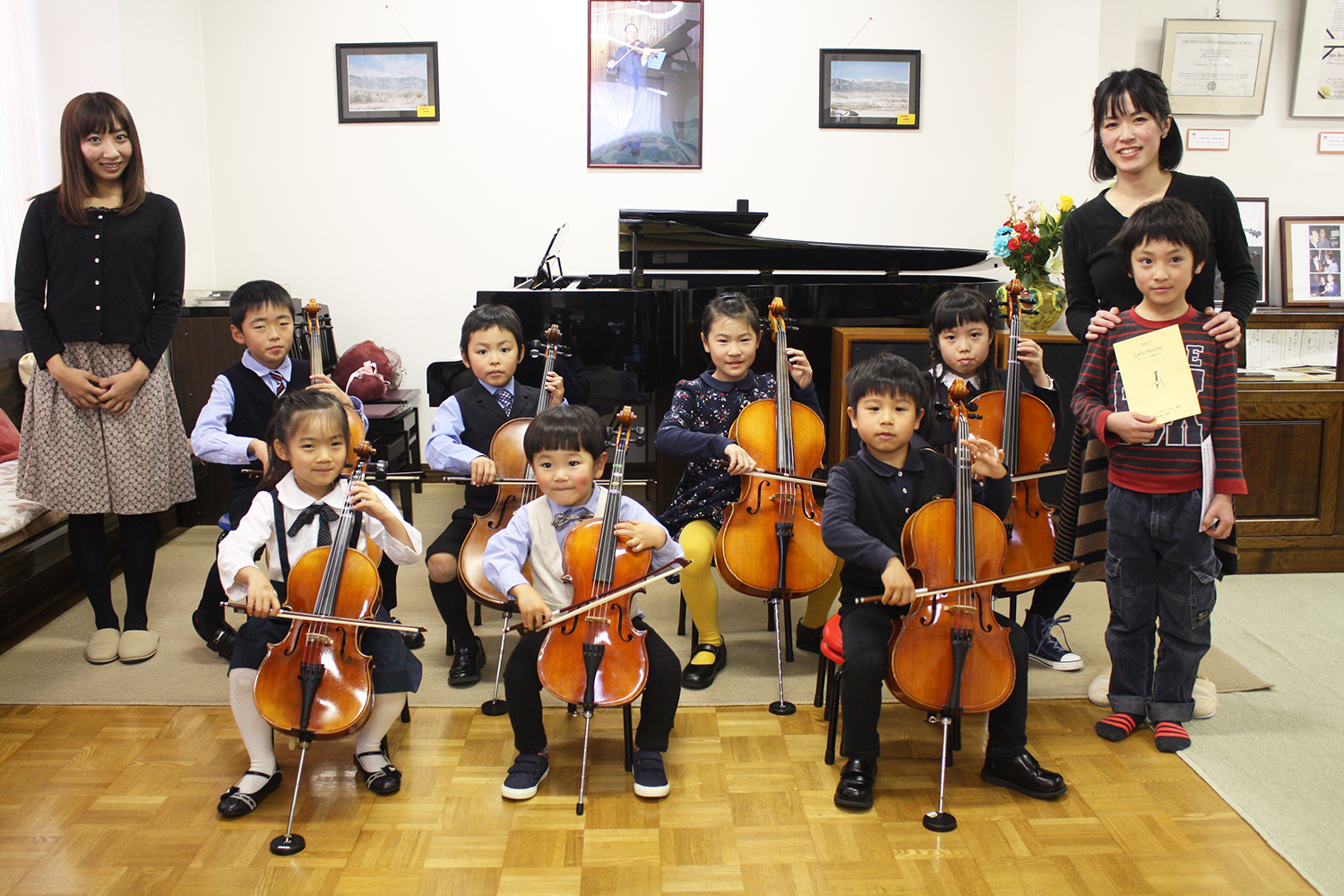 個人レッスン月3回、グループレッスン1回(日曜日に開催)。クラスの独奏会も行なっています。スズキ・メソード チェロ指導曲集(全音楽譜出版社)を中心に行ないます。