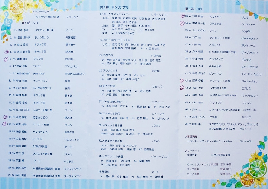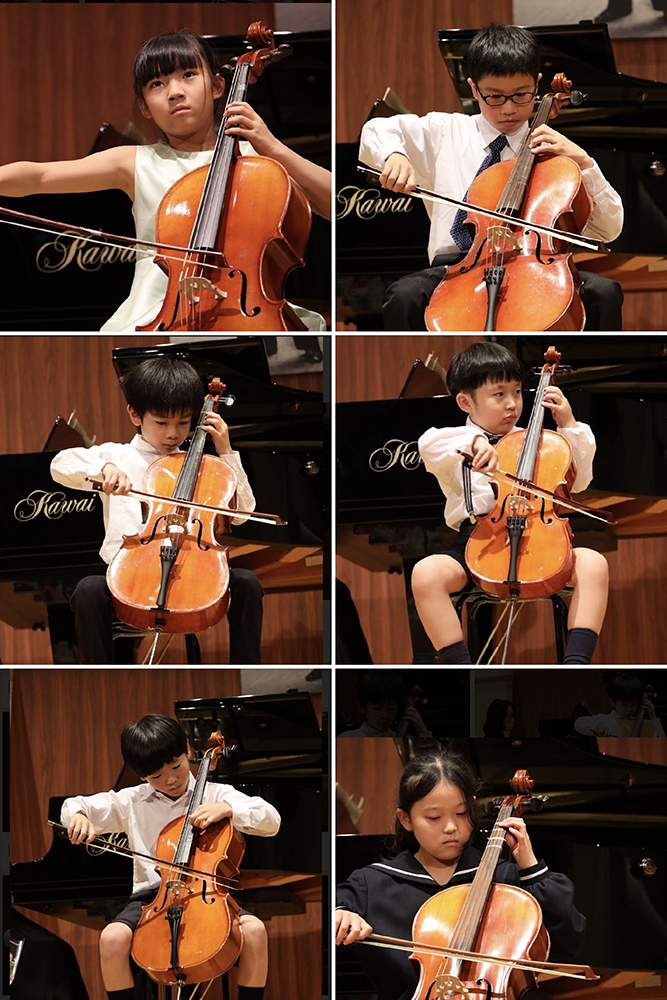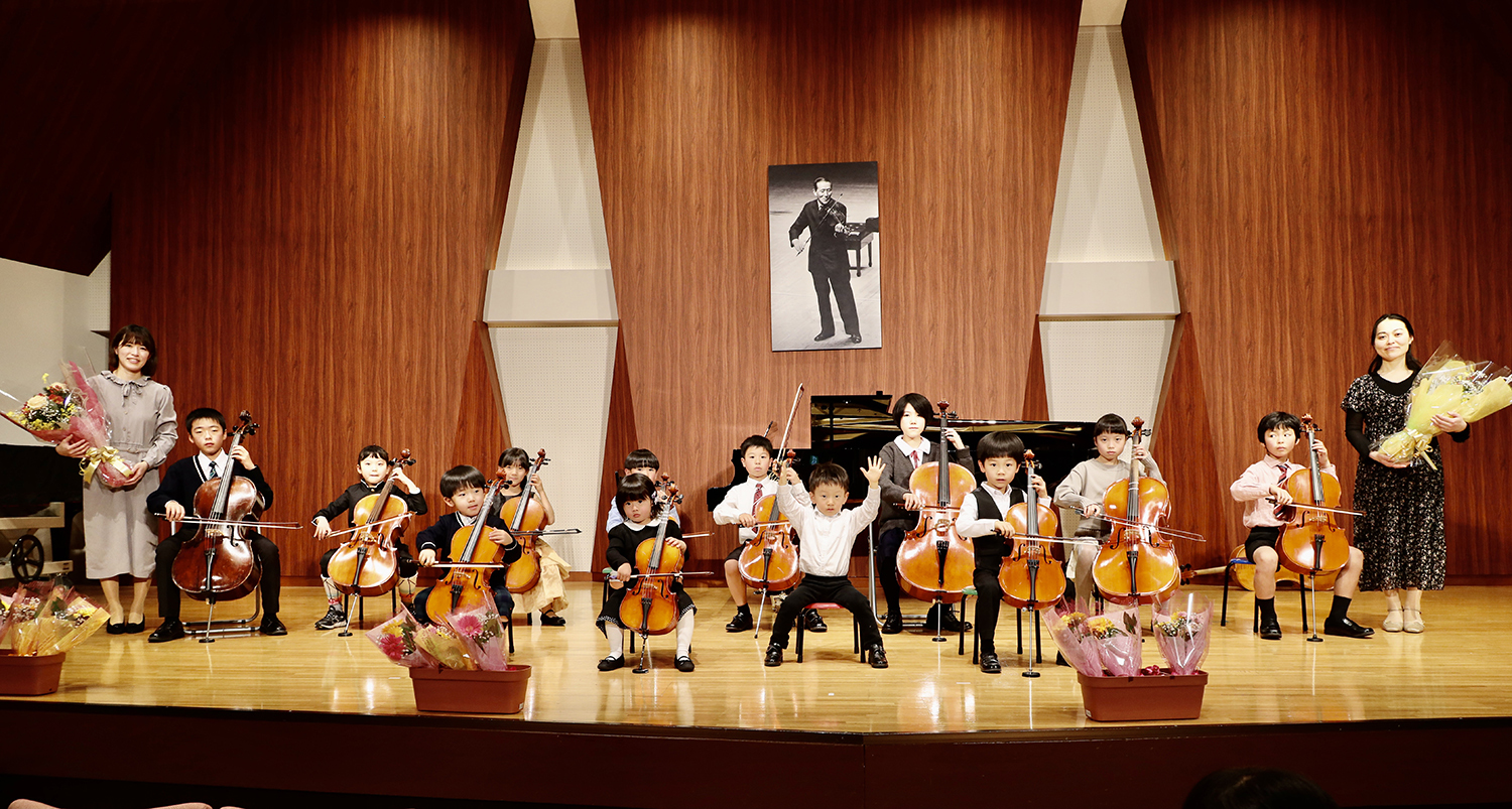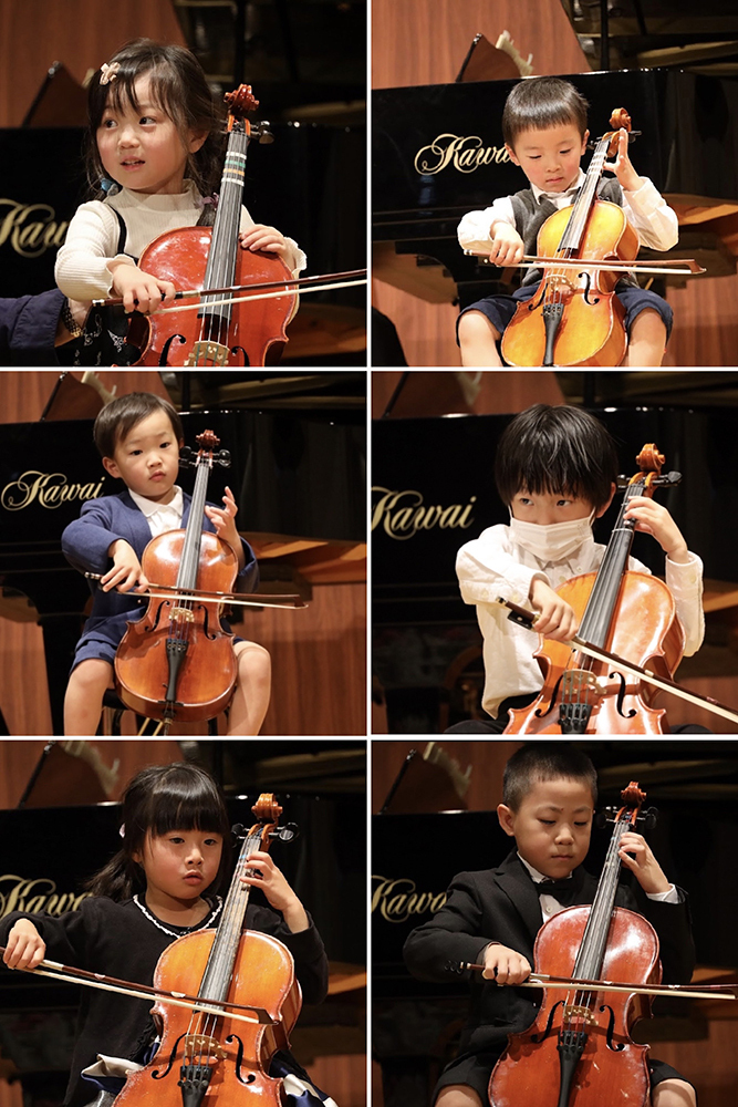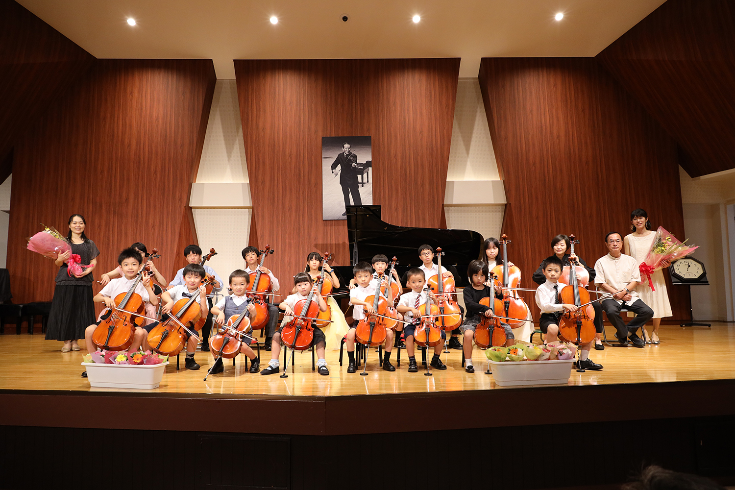個人レッスン月3回、グループレッスン1回(日曜日に開催)。クラスの独奏会も行なっています。スズキ・メソード チェロ指導曲集(全音楽譜出版社)を中心に行ないます。