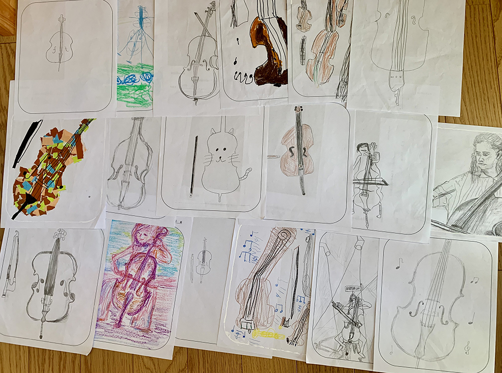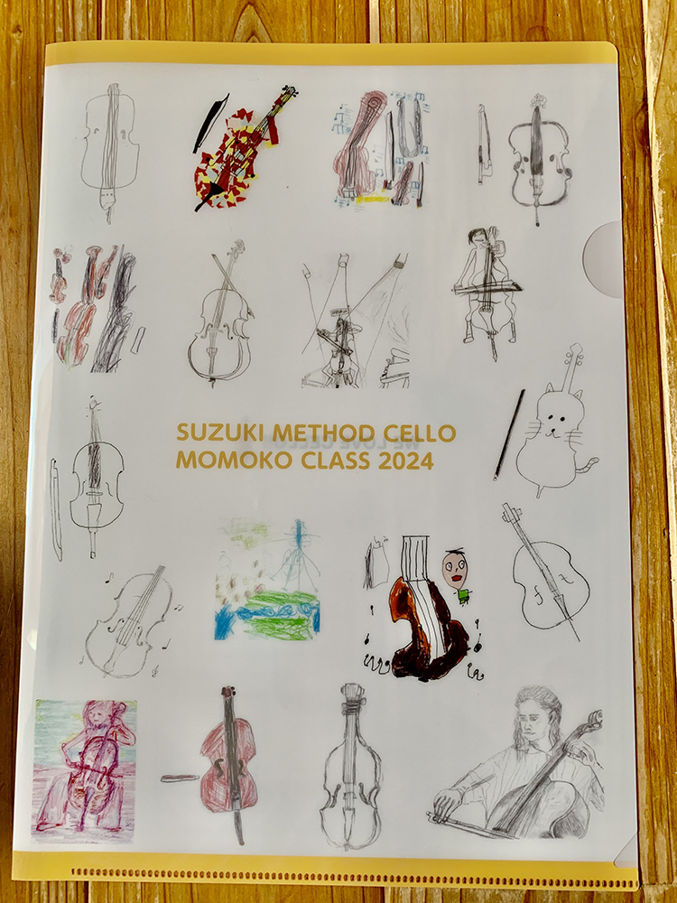 夏休みの宿題で描いてもらった「チェロの絵」。先輩先生のアイディアをいただきクリアファイルにして生徒たちにプレゼントしました。