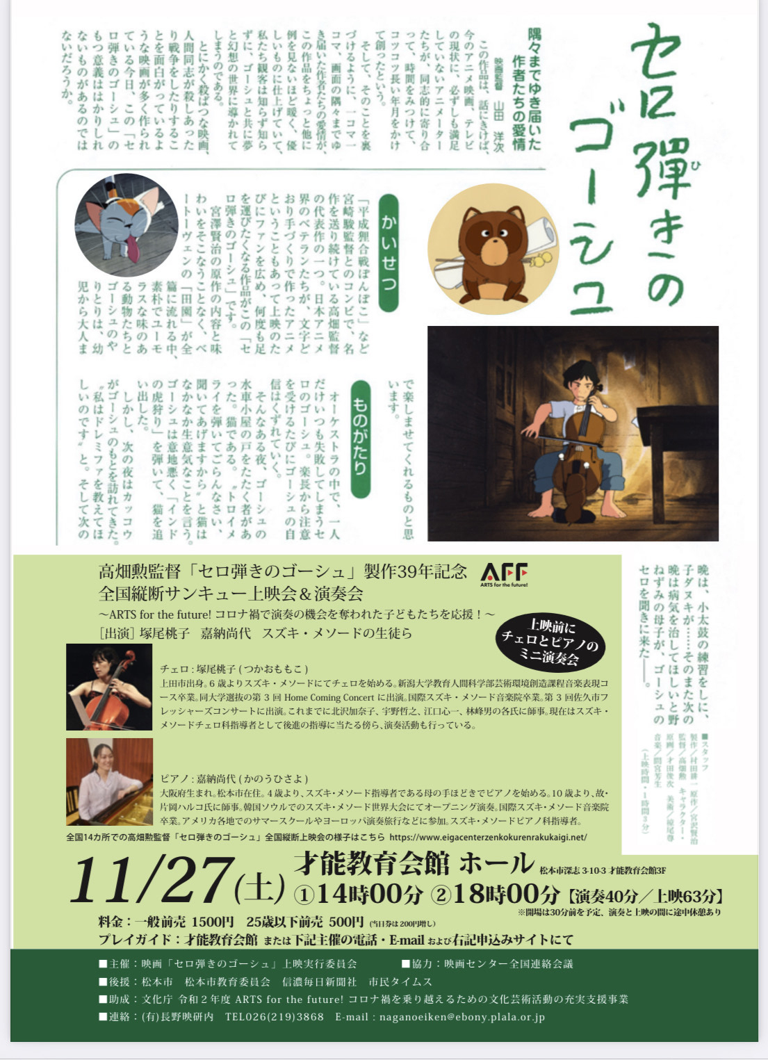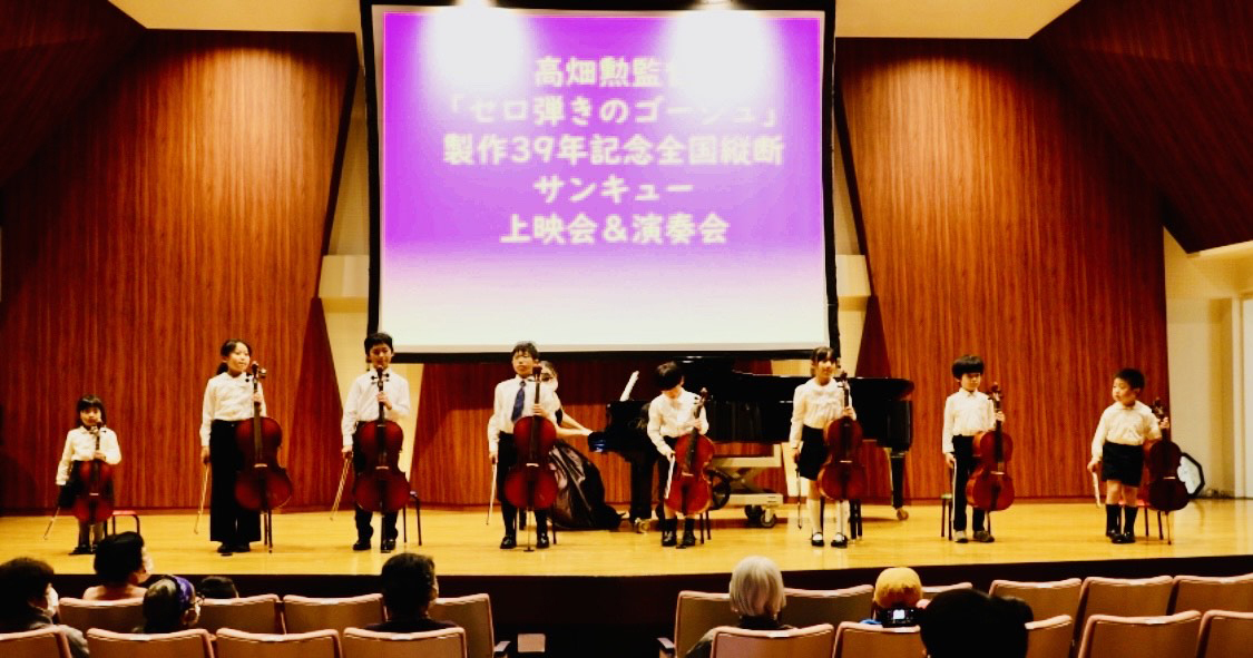 宮沢賢治原作・高畑勲監督によるアニメーション映画『セロ弾きのゴーシュ』(1982年)が製作から39周年を迎えることを記念し、全国14ヵ所での上映会があり、長野県での上映は、松本市の才能教育会館を会場に実施され、塚尾クラスの生徒たちが出演させていただきました。