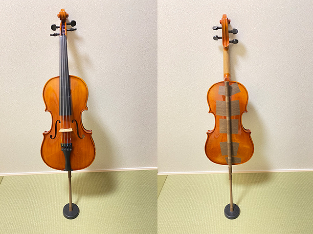 お母様のアイディアで、エンドピンはなんとつっぱり棒!長さの調節ができて良いですね!