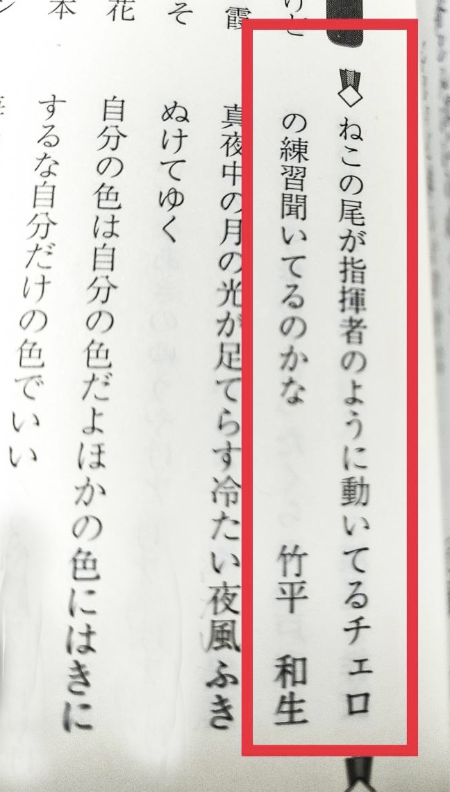 「僕のうちには2才になる猫がいます。たまという名前です。赤ちゃんの時に保護しました。その時からずっと僕のチェロを聞いています。毎日、僕のベッドで寝転んで練習を聞いているので、その時の様子を短歌にしました」
