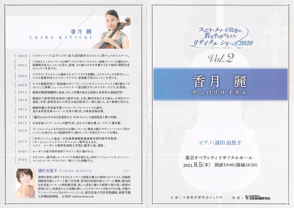 2020年3月7日に予定されていた「スズキ・メソード出身の若きチェリストたちリサイタルシリーズ」第2弾「香月麗チェロリサイタル」は、2021年1月30日(土)に延期され、さらに緊急事態宣言で中止。残念ながら再度延期となりましたが、2021年8月5日(土)に、ようやく開催されました。